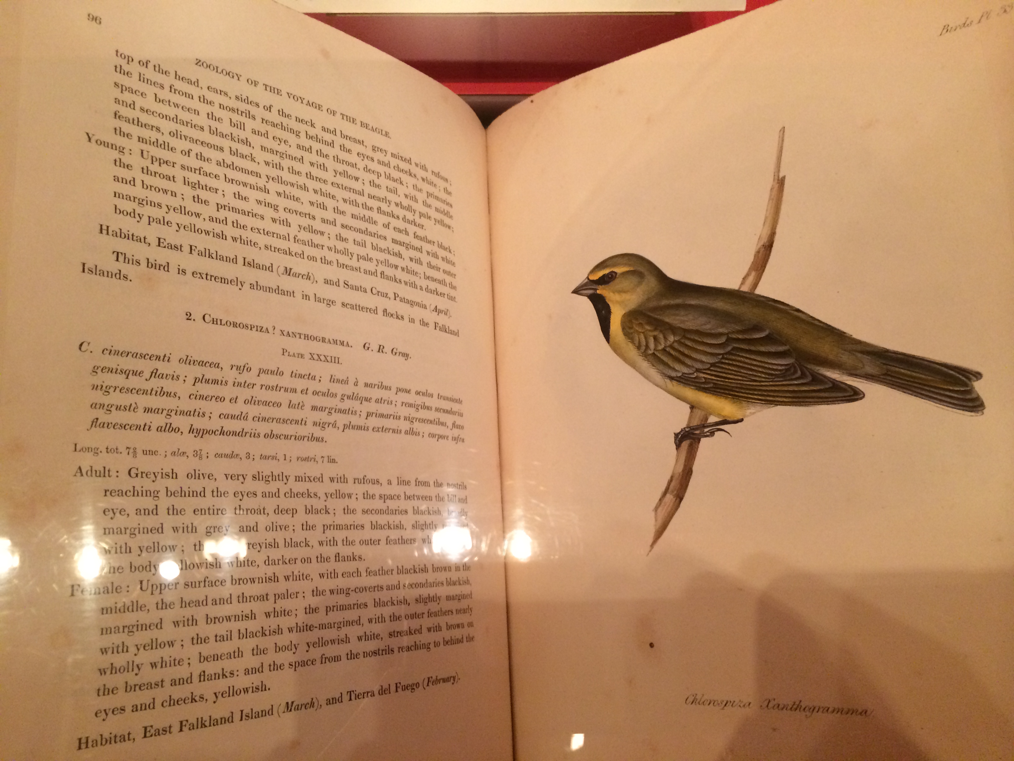 The Huntington in San Marino, CA has big, bountiful gardens, classic american and european art, and a supremely impressive and world-class library, containing among other things, an original copy of the first scientific journal, ever, from the 1600’s. A wonderful permanent exhibit in the library, Beautiful Science, showcases, chronologically, many important historical documents/texts and instruments that were key to advancements in four fields: Astronomy, Natural History, Medicine, and Electricity. Within the Natural History section lies a most excellent, succinct historical primer on evolution. I snapped some photos, and for educational purposes, I am reprinting highlights below. Of course if you’re in LA, I recommend setting aside half-a-day to see the Huntington in person.